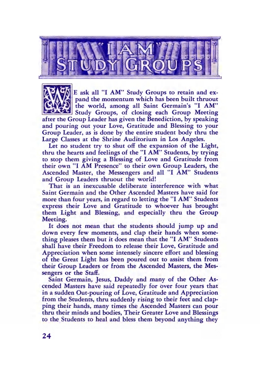 We ask all "I AM" Study Groups to retain and expand the momentum which has been built thruout the world, among all Saint Germain's "I AM" Study Groups, of closing each Group Meeting after the Group Leader has given the Benediction, by speaking and pouring out your Love...About the Edition