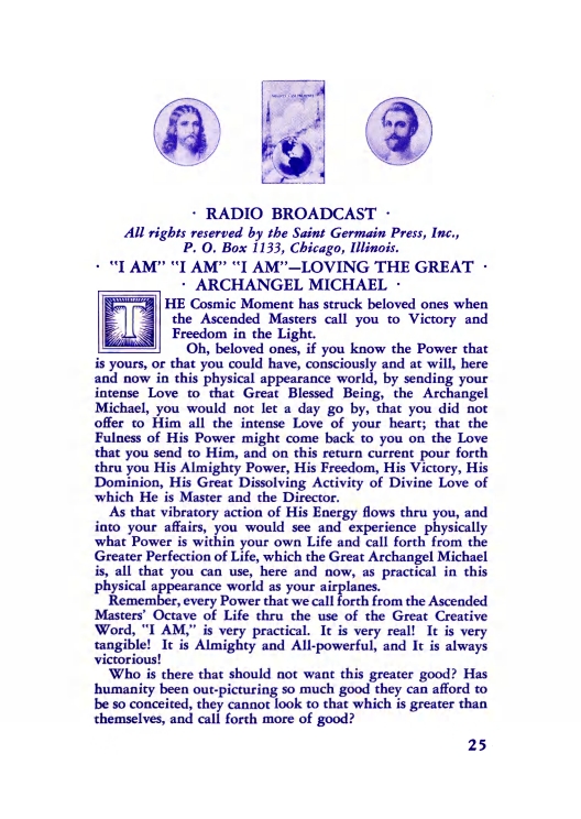 The "Voice of the I AM" monthly Magazine is the Outpouring of the Love, Light, and Illumination from the Beloved Ascended Masters for the enlightenment of all mankind-the Ascended Masters' Instruction on the Fiery Christ Truth of the "Beloved Mighty I AM Presence." The Ascended Masters' Instruction on the Great Laws of Life was first brought forth by the Ascended Master Saint Germain, through His Accredited Messengers, Mr and Mrs GW Ballard. In the early 1930s the Ballards established Saint Germain Foundation and Saint Germain Press, currently a worldwide organization with hundreds of "I AM" Temples and Sanctuaries throughout the world. The "I AM" Activity of Saint Germain Foundation presents this Original Ascended Master Instruction in its pure, unadulterated form, free from human interpretation, in The Voice of the "I AM" monthly Magazine, in the Books of the Saint Germain Series, and in other material released by Saint Germain Foundation and distributed through Saint Germain Press.Associated Items