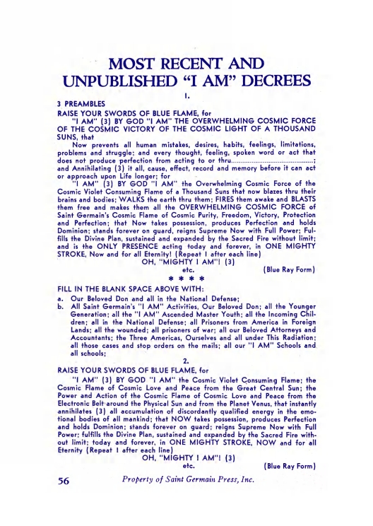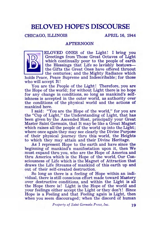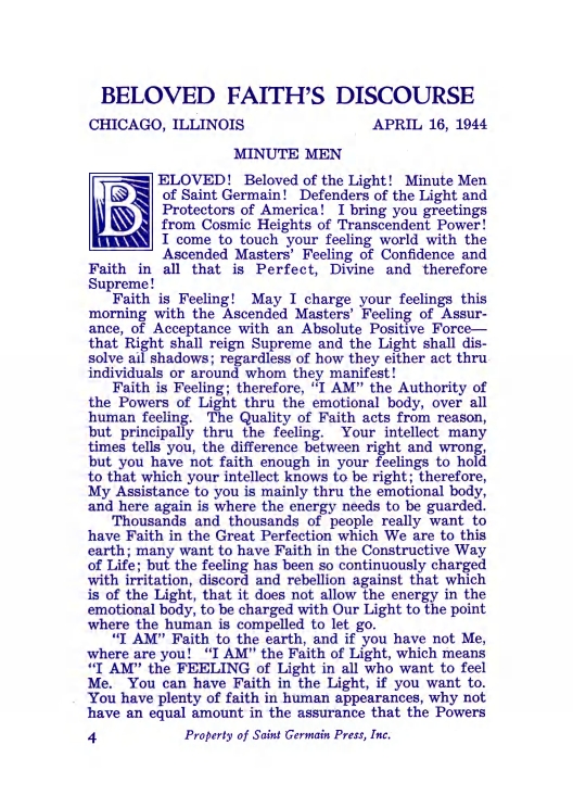 The "Voice of the I AM" monthly Magazine is the Outpouring of the Love, Light, and Illumination from the Beloved Ascended Masters for the enlightenment of all mankind-the Ascended Masters' Instruction on the Fiery Christ Truth of the "Beloved Mighty I AM Presence." The Ascended Masters' Instruction on the Great Laws of Life was first brought forth by the Ascended Master Saint Germain, through His Accredited Messengers, Mr and Mrs GW Ballard. In the early 1930s the Ballards established Saint Germain Foundation and Saint Germain Press, currently a worldwide organization with hundreds of "I AM" Temples and Sanctuaries throughout the world. The "I AM" Activity of Saint Germain Foundation presents this Original Ascended Master Instruction in its pure, unadulterated form, free from human interpretation, in The Voice of the "I AM" monthly Magazine, in the Books of the Saint Germain Series, and in other material released by Saint Germain Foundation and distributed through Saint Germain Press.