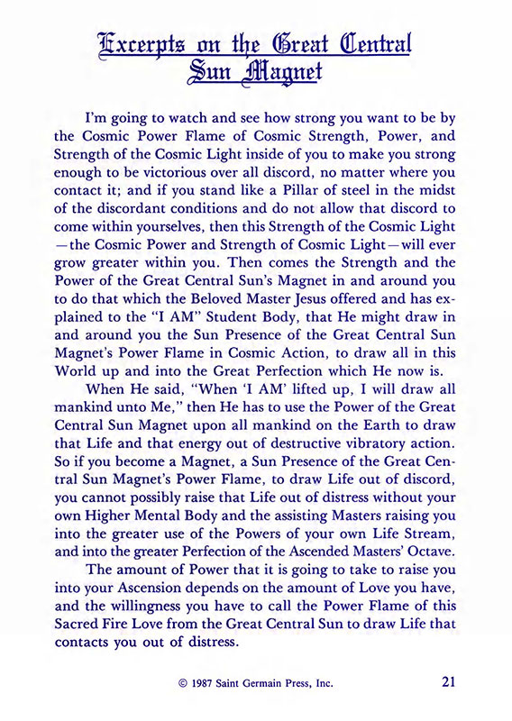 The "Voice of the I AM" monthly Magazine is the Outpouring of the Love, Light, and Illumination from the Beloved Ascended Masters for the enlightenment of all mankind-the Ascended Masters' Instruction on the Fiery Christ Truth of the "Beloved Mighty I AM Presence." The Ascended Masters' Instruction on the Great Laws of Life was first brought forth by the Ascended Master Saint Germain, through His Accredited Messengers, Mr and Mrs GW Ballard. In the early 1930s the Ballards established Saint Germain Foundation and Saint Germain Press, currently a worldwide organization with hundreds of "I AM" Temples and Sanctuaries throughout the world. The "I AM" Activity of Saint Germain Foundation presents this Original Ascended Master Instruction in its pure, unadulterated form, free from human interpretation, in The Voice of the "I AM" monthly Magazine, in the Books of the Saint Germain Series, and in other material released by Saint Germain Foundation and distributed through Saint Germain Press.