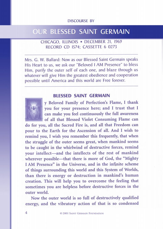 The "Voice of the I AM" monthly Magazine is the Outpouring of the Love, Light, and Illumination from the Beloved Ascended Masters for the enlightenment of all mankind-the Ascended Masters' Instruction on the Fiery Christ Truth of the "Beloved Mighty I AM Presence." The Ascended Masters' Instruction on the Great Laws of Life was first brought forth by the Ascended Master Saint Germain, through His Accredited Messengers, Mr and Mrs GW Ballard. In the early 1930s the Ballards established Saint Germain Foundation and Saint Germain Press, currently a worldwide organization with hundreds of "I AM" Temples and Sanctuaries throughout the world. The "I AM" Activity of Saint Germain Foundation presents this Original Ascended Master Instruction in its pure, unadulterated form, free from human interpretation, in The Voice of the "I AM" monthly Magazine, in the Books of the Saint Germain Series, and in other material released by Saint Germain Foundation and distributed through Saint Germain Press.Associated Items