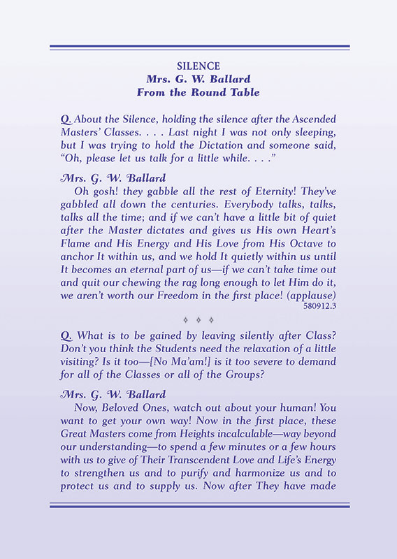 Poem - Diamond Heart!; Discourse by Saint Germain; Discourse by Rose of Light; Round Table Talks - Silence; Mothers of the World - Lord Maha Chohan; "I AM" Decrees.