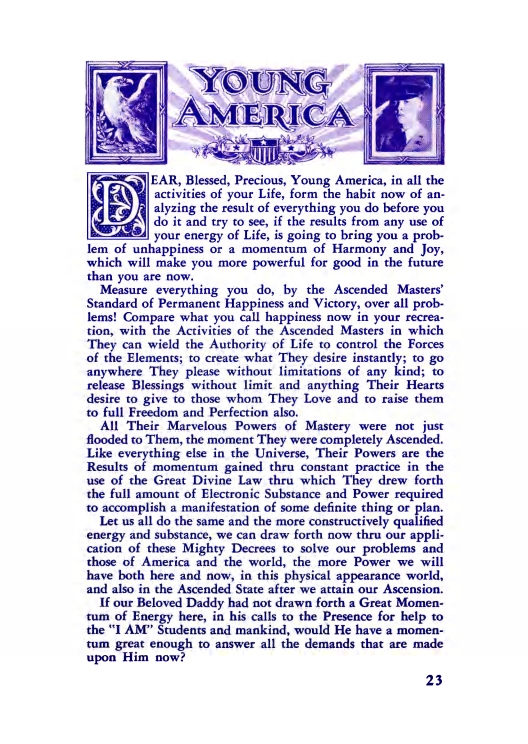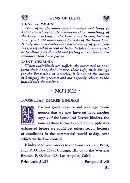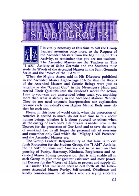 The "Voice of the I AM" monthly Magazine is the Outpouring of the Love, Light, and Illumination from the Beloved Ascended Masters for the enlightenment of all mankind-the Ascended Masters' Instruction on the Fiery Christ Truth of the "Beloved Mighty I AM Presence." The Ascended Masters' Instruction on the Great Laws of Life was first brought forth by the Ascended Master Saint Germain, through His Accredited Messengers, Mr and Mrs GW Ballard. In the early 1930s the Ballards established Saint Germain Foundation and Saint Germain Press, currently a worldwide organization with hundreds of "I AM" Temples and Sanctuaries throughout the world. The "I AM" Activity of Saint Germain Foundation presents this Original Ascended Master Instruction in its pure, unadulterated form, free from human interpretation, in The Voice of the "I AM" monthly Magazine, in the Books of the Saint Germain Series, and in other material released by Saint Germain Foundation and distributed through Saint Germain Press.