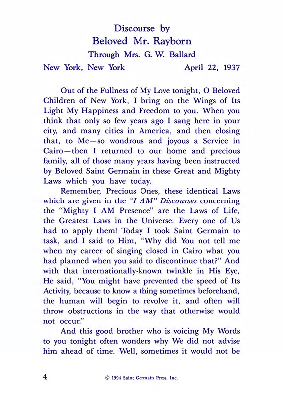 The "Voice of the I AM" monthly Magazine is the Outpouring of the Love, Light, and Illumination from the Beloved Ascended Masters for the enlightenment of all mankind-the Ascended Masters' Instruction on the Fiery Christ Truth of the "Beloved Mighty I AM Presence." The Ascended Masters' Instruction on the Great Laws of Life was first brought forth by the Ascended Master Saint Germain, through His Accredited Messengers, Mr and Mrs GW Ballard. In the early 1930s the Ballards established Saint Germain Foundation and Saint Germain Press, currently a worldwide organization with hundreds of "I AM" Temples and Sanctuaries throughout the world. The "I AM" Activity of Saint Germain Foundation presents this Original Ascended Master Instruction in its pure, unadulterated form, free from human interpretation, in The Voice of the "I AM" monthly Magazine, in the Books of the Saint Germain Series, and in other material released by Saint Germain Foundation and distributed through Saint Germain Press.Associated Items