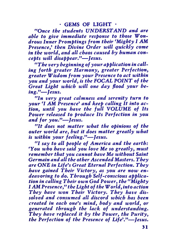 The "Voice of the I AM" monthly Magazine is the Outpouring of the Love, Light, and Illumination from the Beloved Ascended Masters for the enlightenment of all mankind-the Ascended Masters' Instruction on the Fiery Christ Truth of the "Beloved Mighty I AM Presence." The Ascended Masters' Instruction on the Great Laws of Life was first brought forth by the Ascended Master Saint Germain, through His Accredited Messengers, Mr and Mrs GW Ballard. In the early 1930s the Ballards established Saint Germain Foundation and Saint Germain Press, currently a worldwide organization with hundreds of "I AM" Temples and Sanctuaries throughout the world. The "I AM" Activity of Saint Germain Foundation presents this Original Ascended Master Instruction in its pure, unadulterated form, free from human interpretation, in The Voice of the "I AM" monthly Magazine, in the Books of the Saint Germain Series, and in other material released by Saint Germain Foundation and distributed through Saint Germain Press.Associated Items