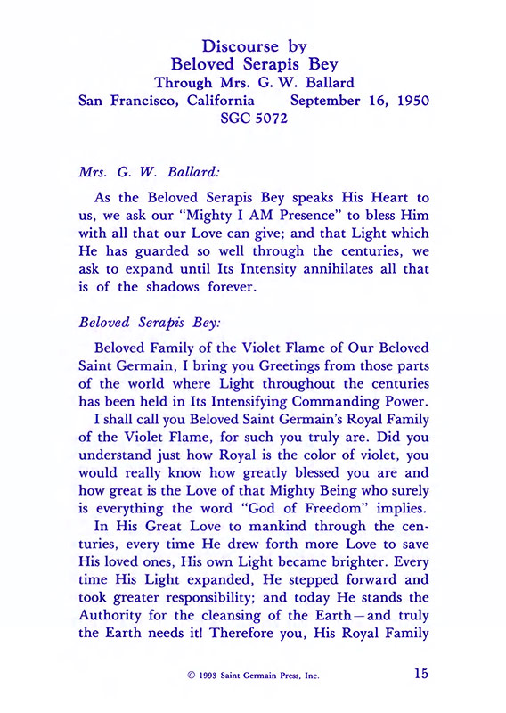 The "Voice of the I AM" monthly Magazine is the Outpouring of the Love, Light, and Illumination from the Beloved Ascended Masters for the enlightenment of all mankind-the Ascended Masters' Instruction on the Fiery Christ Truth of the "Beloved Mighty I AM Presence." The Ascended Masters' Instruction on the Great Laws of Life was first brought forth by the Ascended Master Saint Germain, through His Accredited Messengers, Mr and Mrs GW Ballard. In the early 1930s the Ballards established Saint Germain Foundation and Saint Germain Press, currently a worldwide organization with hundreds of "I AM" Temples and Sanctuaries throughout the world. The "I AM" Activity of Saint Germain Foundation presents this Original Ascended Master Instruction in its pure, unadulterated form, free from human interpretation, in The Voice of the "I AM" monthly Magazine, in the Books of the Saint Germain Series, and in other material released by Saint Germain Foundation and distributed through Saint Germain Press.