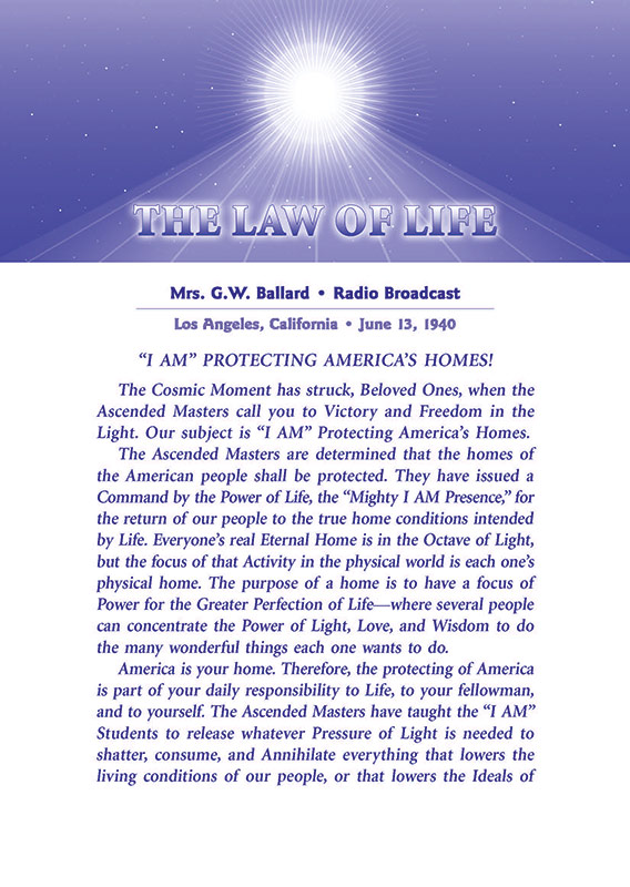 Radio Broadcast, Mrs GW Ballard: The Cosmic Moment has struck, Beloved Ones, when theAscended Masters call you to Victory and Freedom in the Light. Our subject is "I AM" Protecting America's Homes. The Ascended Masters are determined that the homes of the American people shall be protected. They have issued a Command...About the Edition