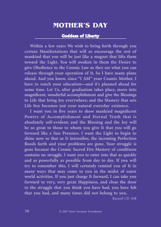The "Voice of the I AM" monthly Magazine is the Outpouring of the Love, Light, and Illumination from the Beloved Ascended Masters for the enlightenment of all mankind-the Ascended Masters' Instruction on the Fiery Christ Truth of the "Beloved Mighty I AM Presence." The Ascended Masters' Instruction on the Great Laws of Life was first brought forth by the Ascended Master Saint Germain, through His Accredited Messengers, Mr and Mrs GW Ballard. In the early 1930s the Ballards established Saint Germain Foundation and Saint Germain Press, currently a worldwide organization with hundreds of "I AM" Temples and Sanctuaries throughout the world. The "I AM" Activity of Saint Germain Foundation presents this Original Ascended Master Instruction in its pure, unadulterated form, free from human interpretation, in The Voice of the "I AM" monthly Magazine, in the Books of the Saint Germain Series, and in other material released by Saint Germain Foundation and distributed through Saint Germain Press.