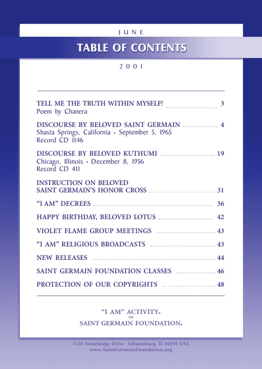 The "Voice of the I AM" monthly Magazine is the Outpouring of the Love, Light, and Illumination from the Beloved Ascended Masters for the enlightenment of all mankind-the Ascended Masters' Instruction on the Fiery Christ Truth of the "Beloved Mighty I AM Presence." The Ascended Masters' Instruction on the Great Laws of Life was first brought forth by the Ascended Master Saint Germain, through His Accredited Messengers, Mr and Mrs GW Ballard. In the early 1930s the Ballards established Saint Germain Foundation and Saint Germain Press, currently a worldwide organization with hundreds of "I AM" Temples and Sanctuaries throughout the world. The "I AM" Activity of Saint Germain Foundation presents this Original Ascended Master Instruction in its pure, unadulterated form, free from human interpretation, in The Voice of the "I AM" monthly Magazine, in the Books of the Saint Germain Series, and in other material released by Saint Germain Foundation and distributed through Saint Germain Press.Associated Items