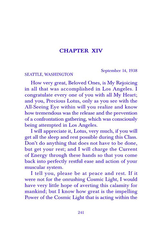 How very great, Beloved Ones, is My Rejoicing in all that was accomplished in Los Angeles. I congratulate every one of you with all My Heart; and you, Precious Lotus, only as you see with the All-Seeing Eye within will you realize and know how tremendous was the release and the prevention of a confrontation gathering, which was consciously being attempted in Los Angeles. ...About the Edition