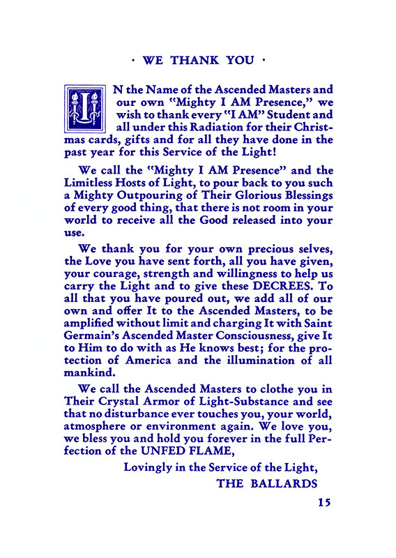 The "Voice of the I AM" monthly Magazine is the Outpouring of the Love, Light, and Illumination from the Beloved Ascended Masters for the enlightenment of all mankind-the Ascended Masters' Instruction on the Fiery Christ Truth of the "Beloved Mighty I AM Presence." The Ascended Masters' Instruction on the Great Laws of Life was first brought forth by the Ascended Master Saint Germain, through His Accredited Messengers, Mr and Mrs GW Ballard. In the early 1930s the Ballards established Saint Germain Foundation and Saint Germain Press, currently a worldwide organization with hundreds of "I AM" Temples and Sanctuaries throughout the world. The "I AM" Activity of Saint Germain Foundation presents this Original Ascended Master Instruction in its pure, unadulterated form, free from human interpretation, in The Voice of the "I AM" monthly Magazine, in the Books of the Saint Germain Series, and in other material released by Saint Germain Foundation and distributed through Saint Germain Press.