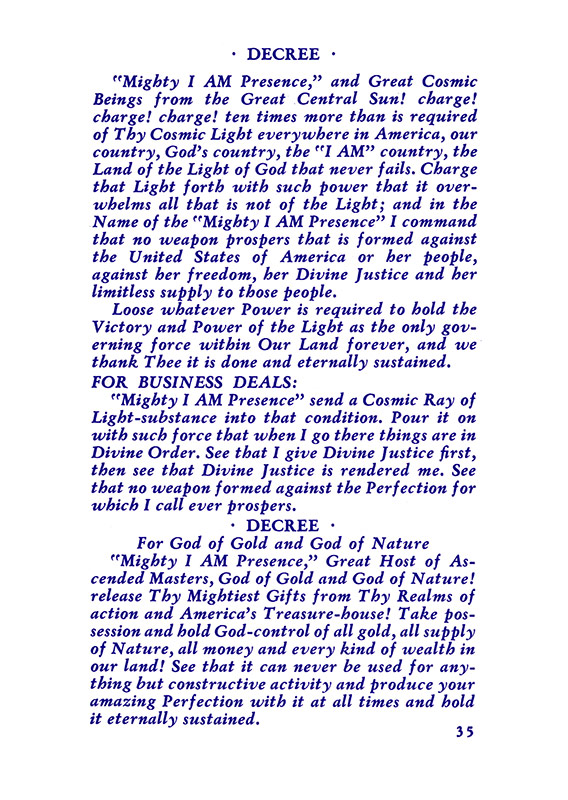 Poem - "I AM" the Door; "I AM" Decrees; Discourse by Mighty Cosmos; Sword of Blue Flame; Cardinal Bonzano's Ascension; "I AM" Service; "I AM" Decrees.