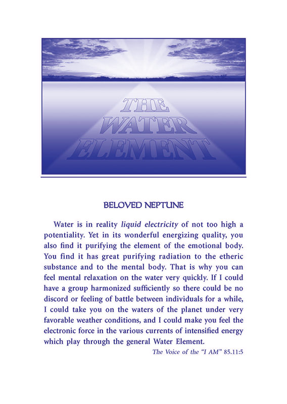 Beloved Neptune: Water is in reality liquid electricity of not too high a potentiality. Yet in its wonderful energizing quality, you also find it purifying the element of the emotional body. You find it has great purifying radiation...