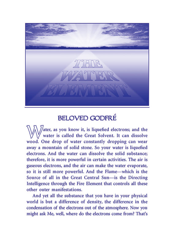 Water, as you know it, is liquefied electrons; and the water is called the Great Solvent. It can dissolve wood. One drop of water constantly dropping can wear away a mountain of solid stone. So your water is liquefied electrons. ...About the Edition